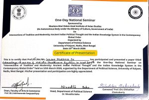 কল্যাণী, ১০ মার্চ: কল্যাণী বিশ্ববিদ্যালয়ের রাষ্ট্রবিজ্ঞান বিভাগের উদ্যোগে একদিনের জাতীয় সেমিনার অনুষ্ঠিত হয়। সেমিনারের বিষয় ছিল— “ঐতিহ্য ও আধুনিকতার ছেদ: প্রাচীন ভারতীয় রাজনৈতিক চিন্তাভাবনা ও সমসাময়িক বিশ্বব্যবস্থায় ভারতীয় জ্ঞান ব্যবস্থা।”